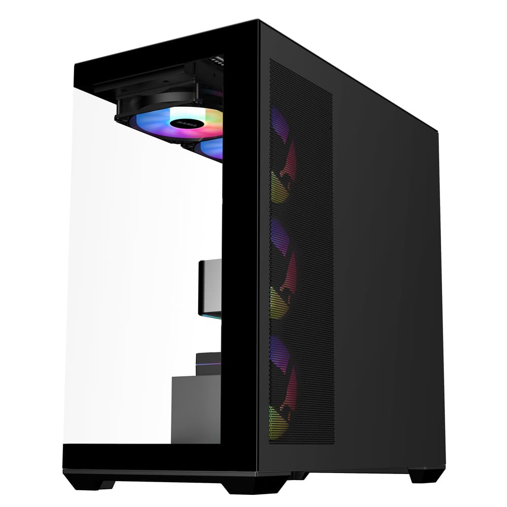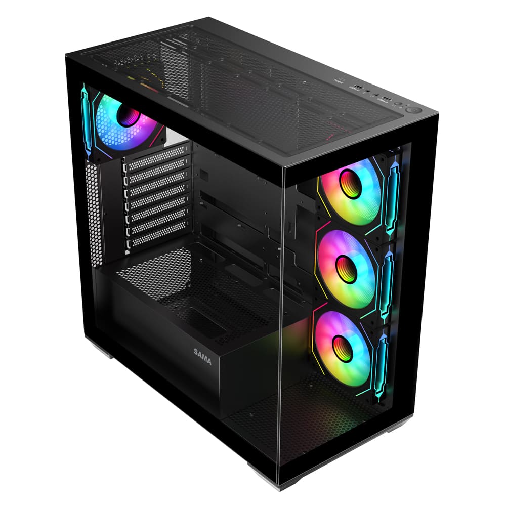 - SAMA offers an excellent black gaming pc case SV01 with visual experience and setup experience, pre-installed 4×120mm ARGB fans; that can be easily controlled by the LED button on the case or managed through motherboard ARGB software.