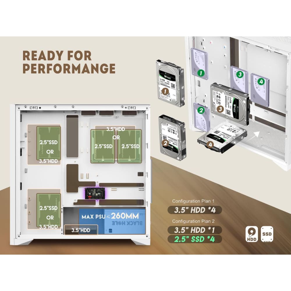- Pre-Installed ARGB Fans: Comes with four ARGB fans (1600 RPM) and an ARGB/PWM fan hub for lighting control and motherboard sync.